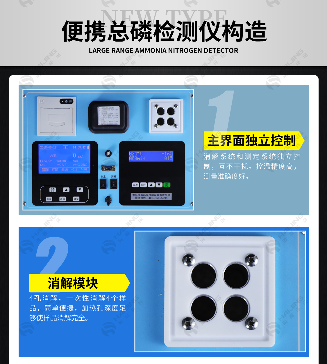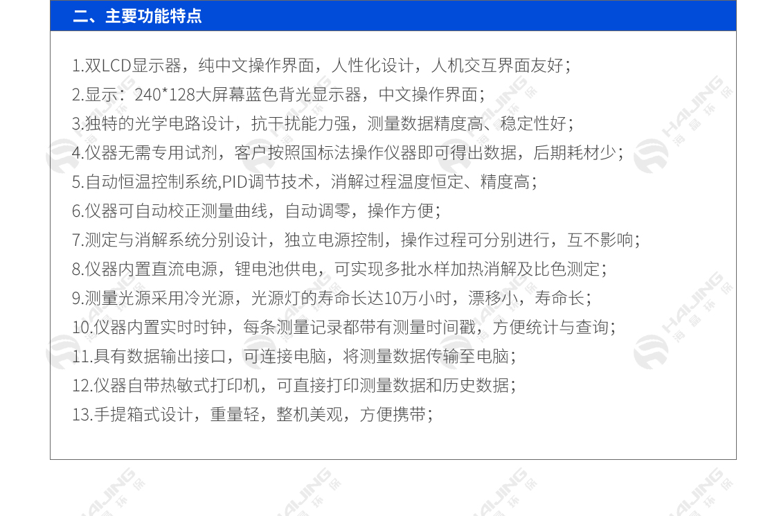儀器內置直流電源,鋰電池供電,可實現多批水樣加熱消解及比色測定;