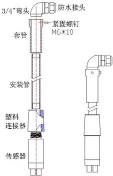 b、 將傳感器的電纜依次穿過(guò)塑料連接管、安裝管、套管、蓋和鎖緊螺母;將傳感器的螺紋與塑料連接套的螺紋孔相接并擰緊;塑料連接套則與安裝管相連;然后將安裝管穿過(guò)套管,根據(jù)現(xiàn)場(chǎng)測(cè)量深度通過(guò)兩個(gè)緊定螺釘將套管固定在安裝管上的合適位置;將彎頭與安裝管擰緊,防止雨水和其他物質(zhì)進(jìn)入安裝管;將鎖緊螺母擰緊,固定電纜。